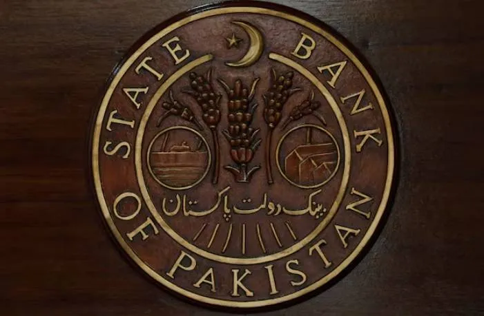 شعار بنك باكستان المركزي على مكتب استقبال بمقره في كراتشي (رويترز)