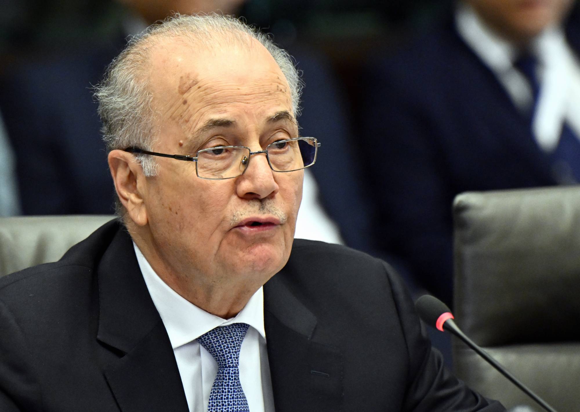 رئيس الوزراء الفلسطيني محمد مصطفى خلال اجتماع للتحالف العالمي لتنفيذ حل الدولتين في بروكسل الاثنين (د.ب.أ)