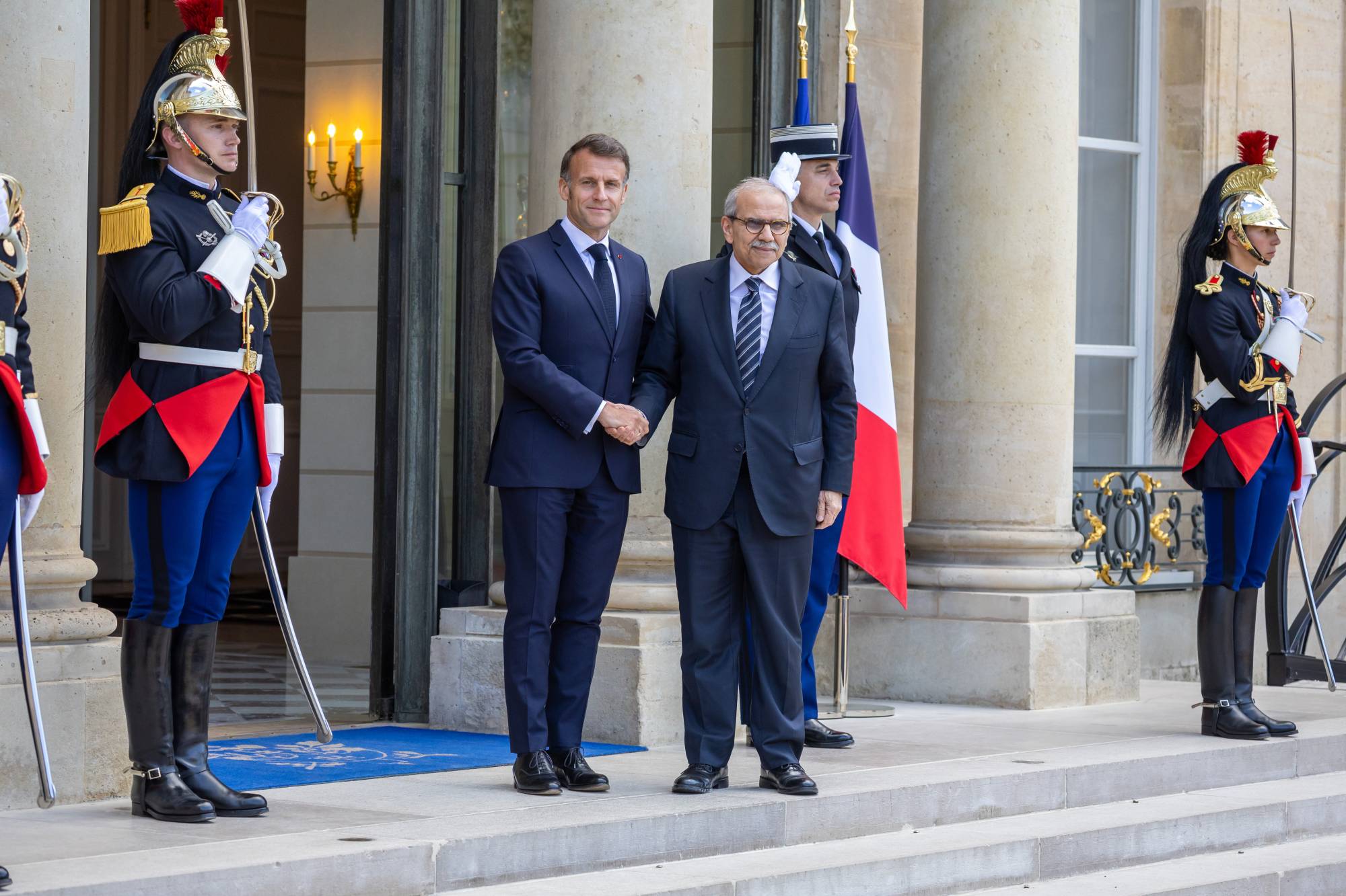 الرئيس الفرنسي إيمانويل ماكرون يستقبل رئيس الوزراء اللبناني نواف سلام لدى وصوله إلى قصر الإليزيه في باريس 21 أبريل 2026 (إ.ب.أ)