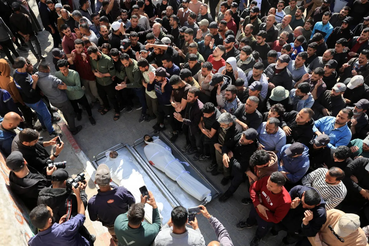 مشيّعون يحضرون جنازة فلسطينيين قُتلوا في غارة إسرائيلية وفق مُسعفين بمستشفى الشفاء بمدينة غزة (رويترز)
