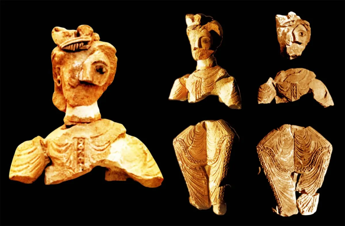 تتّضح هوية هذا اللباس في الجزء الأسفل من المجسّم، وهو الجزء الخاص بالساقين. يظهر الملك في وضعيّة الجلوس، ويرتدي بزّة طويلة تلتف حول الركبتين المتباعدتين، تزيّنها كذلك ثنايا مقوّسة متجانسة، يفصل بينها في الوسط خيط عمودي، مستقيم وغائر. تحت هذه البزّة سروال فضفاض، يحدّ كلّ طرف من طرفيه شريط عمودي مزخرف، يماثل في زخرفته الشريط الذي يتوسط البزّة. تأخذ الساقان المتباعدتان والمتواجهتان شكل مثلث تدلّى منه طرف القدم اليسرى. يتبنّى هذا المجسّم الأموي في الواقع نموذجاً ملكياً تقليدياً خاصاً، عُرف به أكاسرة الفرس الساسانيون. دخل هذا النموذج العالم المتوسّطي بشكل واسع، وانتقل إلى العالم الأموي حيث تبنّته الخلافة التي ورثت مجد الأكاسرة، وفقاً لرؤية حضارية، اختزلها قول مأثور اشتهر به الخليفة يزيد بن الوليد بن عبد الملك: «أنا ابن كسرى وأبي مروان/ وقيصر جدي وجدي خاقان».