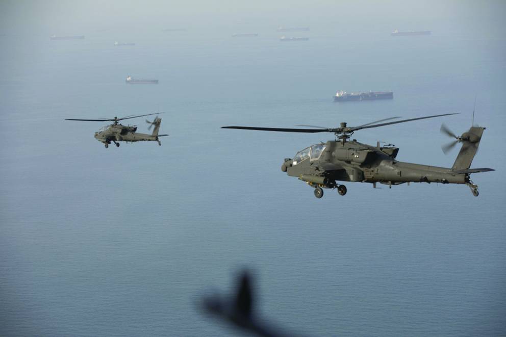 مروحيتان هجوميتان أميركيتان من طراز «إيه إتش - 64 أباتشي» تحلّقان فوق مضيق هرمز (سنتكوم)
